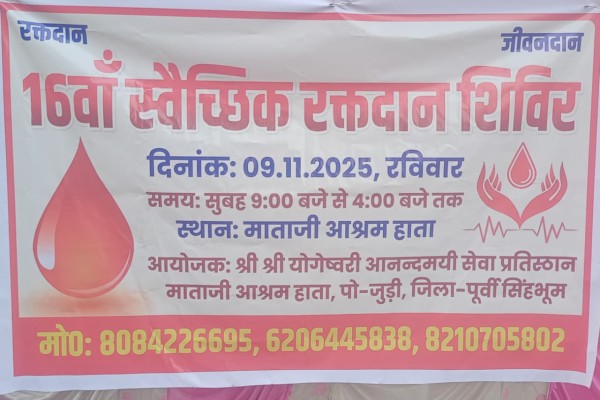 जमशेदपुर: हर वर्ष की भांति इस वर्ष भी आगामी 9 नवंबर रविवार को माताजी आश्रम हाता में 16वां रक्तदान शिविर आयोजित किया जाएगा। श्रीश्री योगेश्वरी आनंदमयी सेवा प्रतिष्ठान माताजी आश्रम में सुबह 9 बजे से 4 बजे तक शिविर लगाया जाएगा। रक्तदान शिविर का आयोजन VBDA और ब्लड बैंक के सहयोग से किया जा रहा है।
