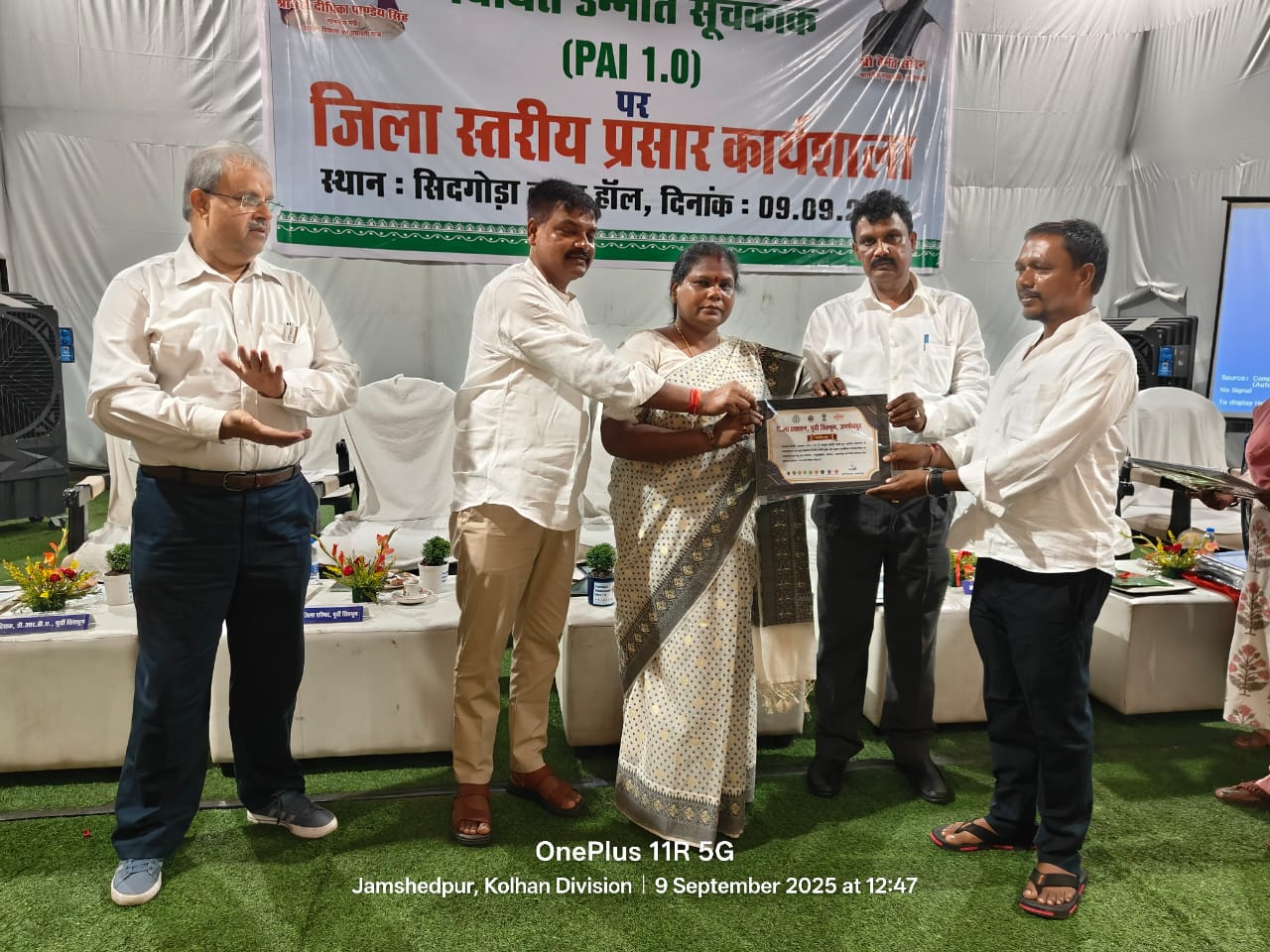 बहरागोड़ा: जिला स्तरीय प्रसार कार्यशाला में बहरागोड़ा प्रखंड की मानुषमुड़िया ग्राम पंचायत को स्वच्छ और हरित पंचायत विषय पर उत्कृष्ट प्रदर्शन के लिए सम्मानित किया गया। पंचायत को यह सम्मान उपायुक्त कर्ण सत्यार्थी के हस्ताक्षरयुक्त प्रशस्ति पत्र के रूप में प्रदान किया गया, जिसे पंचायत की मुखिया राम मुर्मू ने ग्रहण किया। प्रशस्ति पत्र जिला परिषद अध्यक्ष बारी मुर्मू और उप विकास आयुक्त ने संयुक्त रूप से सौंपा।