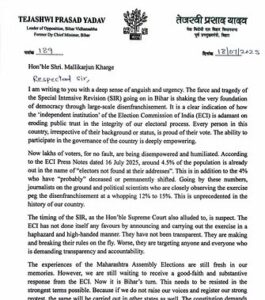 पटना: बिहार विधानसभा में नेता प्रतिपक्ष और राज्य के पूर्व उप मुख्यमंत्री तेजस्वी यादव ने एक बार फिर मतदाता अधिकारों को लेकर देशभर में आवाज बुलंद की है. इस बार उन्होंने चिट्ठियों के माध्यम से राष्ट्रीय स्तर पर विपक्षी नेताओं का ध्यान आकृष्ट किया है.