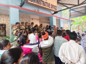 और सेल जनरल ऑफिस के अंदर जोरदार नारेबाजी करने लगे। उसके बाद किरीबुरू के इंस्पेक्टर बमबम कुमार ने मोर्चा संभालते हुए सभी आंदोलनकारी को शांत कराया उसके बाद वार्ता के लिए निष्पक्ष बात करने की बात रखी गई। इस दौरान कई दौर की बैठक के बाद सेल प्रबंधन ने जायज मुआवजा तथा कांटेक्ट बेसिस पर नौकरी देने की बात कही जिस पर संयुक्त यूनियनों एवं ग्रामीणों ने साफ-साफ मना कर दिया और कहा कि तुरंत ही स्थाई नौकरी मृतक के आश्रित को 20 लाख रुपया मुआवजा दी जाए। उसके बाद आंदोलनकारी ने गुवा खदान दूसरी पाली जाने वाले सभी बसों को रोक दिया गया। निर्माण कार्य के दौरान हुआ हादसा मृतक कानू चाम्पिया (पिता – चोन्द्रो चाम्पिया), ग्राम ठाकुरा निवासी, गुवा खदान के जीरो प्वाइंट एरिया में चल रहे एक नए भवन निर्माण कार्य में ठेका मजदूर के रूप में काम कर रहा था।