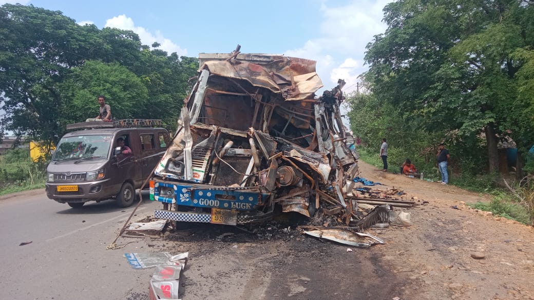 गम्हरिया: कांड्रा-सरायकेला मुख्य मार्ग पर दुगनी कोलढीपी के पास मंगलवार रात करीब एक बजे अनाज लदा ट्रक आगे से जा रही दूसरे वाहन से टकरा गयी, हालांकि टक्कर लगते ही दूसरा वाहन का चालक वाहन लेकर फरार हो गया. टक्कर इतनी तेज थी कि ट्रक का आगे का हिस्सा क्षतिग्रस्त हो गया. वहीं शॉट सर्किट होने की वजह से ट्रक में आग लग गयी. इससे काफी मात्रा में अनाज भी जल गयी. उक्त घटना में चालक व खलासी को भी चोटें आयी, ट्रक में आग लगते देख दोनों निकल कर भाग गये. ट्रक में आग लगते ही उक्त मार्ग पर अफरा-तफरी मच गयी. वहीं आस पास के लोगों ने घटना की जानकारी सरायकेला थाना पुलिस को दी गयी. सूचना पाकर पहुंची पुलिस ने दमकल के माध्यम से आग पर काबू पाया.