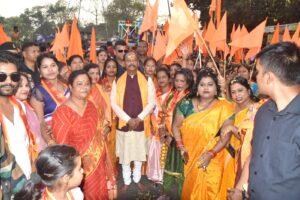 जमशेदपुर :  सिदगोड़ा स्थित सूर्यधाम परिसर में बने श्रीराम मंदिर के पंचम वर्षगांठ पर सूर्य मंदिर समिति द्वारा धूमधाम से शोभायात्रा निकाली गई। शुक्रवार दोपहर करीब 4 बजे न्यू बारीडीह क्षेत्र के सुगना कॉलोनी स्थित बाबा विश्वनाथ मंदिर से सुसज्जित रथ पर मर्मज्ञ कथा वाचक आचार्य राजेन्द्र जी महाराज, प्रयागराज महाकुंभ के साधु-संतों एवं श्रीराम दरबार और वीर बजरंगबली की मनोरम झांकी, घोड़े, डीजे संगीत, आतिशबाजी व केसरिया ध्वजों के साथ निकाली गई भव्य शोभायात्रा में शहर के हजारों श्रद्धालुओं के संग राज्य के पूर्व मुख्यमंत्री सह सूर्य मंदिर समिति के मुख्य संरक्षक रघुवर दास एवं संरक्षक चंद्रगुप्त सिंह मुख्यरूप से शामिल हुए। भगवान श्रीराम की शोभा यात्रा को देखने और स्वागत करने के लिए सड़क के दोनों ओर भारी भीड़ मौजूद रही। महिलाएं, बच्चे, पुरुष सभी ने जय श्री राम के जयकारे लगाते हुए शोभा यात्रा पर पुष्पवर्षा कर स्वागत किया। शोभा यात्रा में पूर्व सीएम रघुवर दास ने माथे पर श्रीरामायण लेकर नंगे पाँव पैदल यात्रा की। इस दौरान विभिन्न स्थानों पर सामाजिक संगठनों ने शिविर लगाकर सेवा प्रदान की। तो वहीं, शहरवासियों ने श्रीरामायण एवं शोभायात्रा पर पुष्पवर्षा कर स्वागत किया। पूरे रास्ते में आतिशबाजी, भक्तिमय संगीत और जय श्री राम के ओजस्वी नारों से पूरा क्षेत्र भगवामय हो गया।