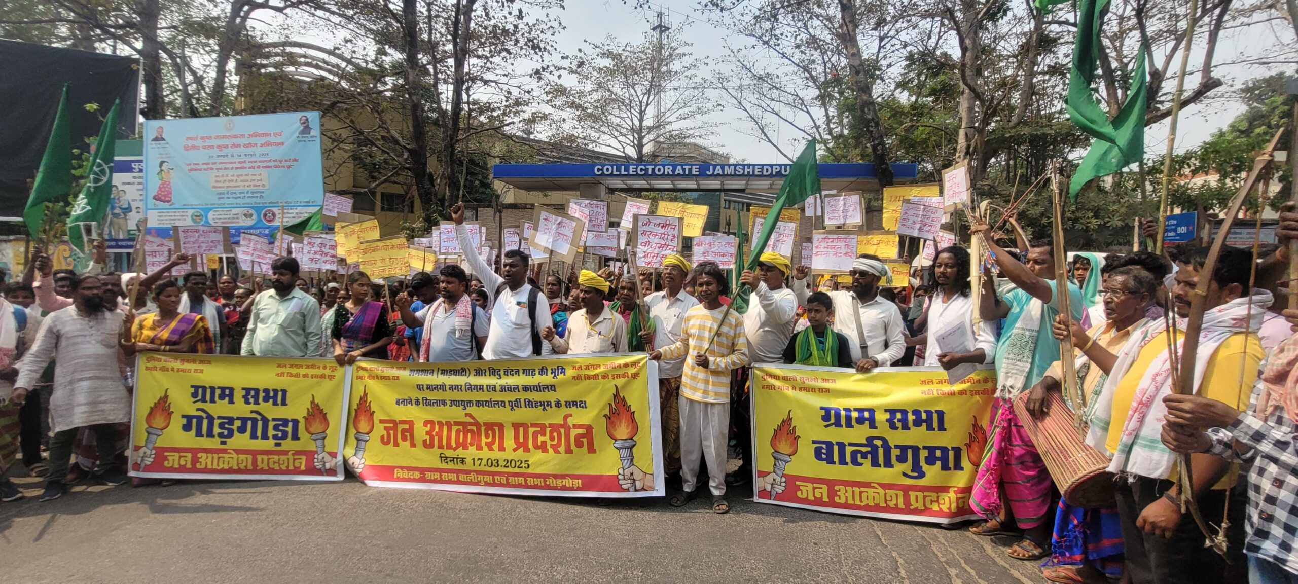 जमशेदपुर: ग्राम सभा बालीगुमा और गोड़गोड़ा के संयुक्त प्रयास से 18 मार्च 2025 को उपायुक्त कार्यालय के समक्ष जन आक्रोश रैली का आयोजन किया गया. इस रैली में बड़ी संख्या में आदिवासी समुदाय के लोग पारंपरिक हथियारों जैसे तीर धनुष और वाद्य यंत्रों के साथ पहुंचे और अपनी मांगों को लेकर जोरदार प्रदर्शन किया. रैली का मुख्य उद्देश्य मानगो नगर निगम कार्यालय और मानगो अंचल कार्यालय के प्रस्तावित निर्माण का विरोध था, जो ग्रामीणों के अनुसार उनकी पारंपरिक भूमि पर किया जा रहा है.