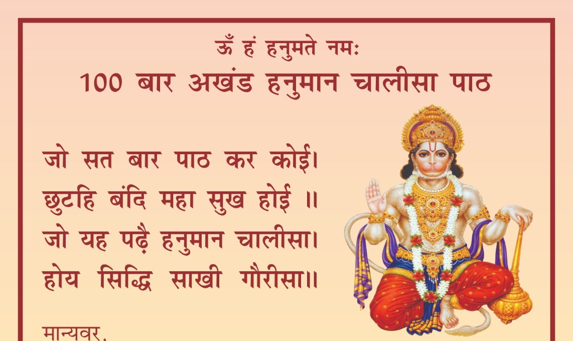 जमशेदपुर: जमशेदपुर पश्चिमी के विधायक सरयू राय ने बताया कि 12 अप्रैल 2025, शनिवार को चैत्र पूर्णिमा के दिन श्री लक्ष्मी नारायण मंदिर (बिड़ला मंदिर), केबुल टाउन के प्रांगण में श्री हनुमान जयंती के अवसर पर 100 बार से अधिक अखंड हनुमान चालीसा पाठ का आयोजन किया जाएगा. हनुमान चालीसा पाठ सुबह 10 बजे से आरंभ होगा और शाम 5 बजे के आसपास पूरा होगा. विधायक सरयू राय के अनुसार, हनुमान चालीसा का एक बार पाठ करने में 4 से 5 मिनट का समय लगता है. इस आधार पर 100 बार अखंड पाठ पूरा करने का समय निर्धारित किया गया है.