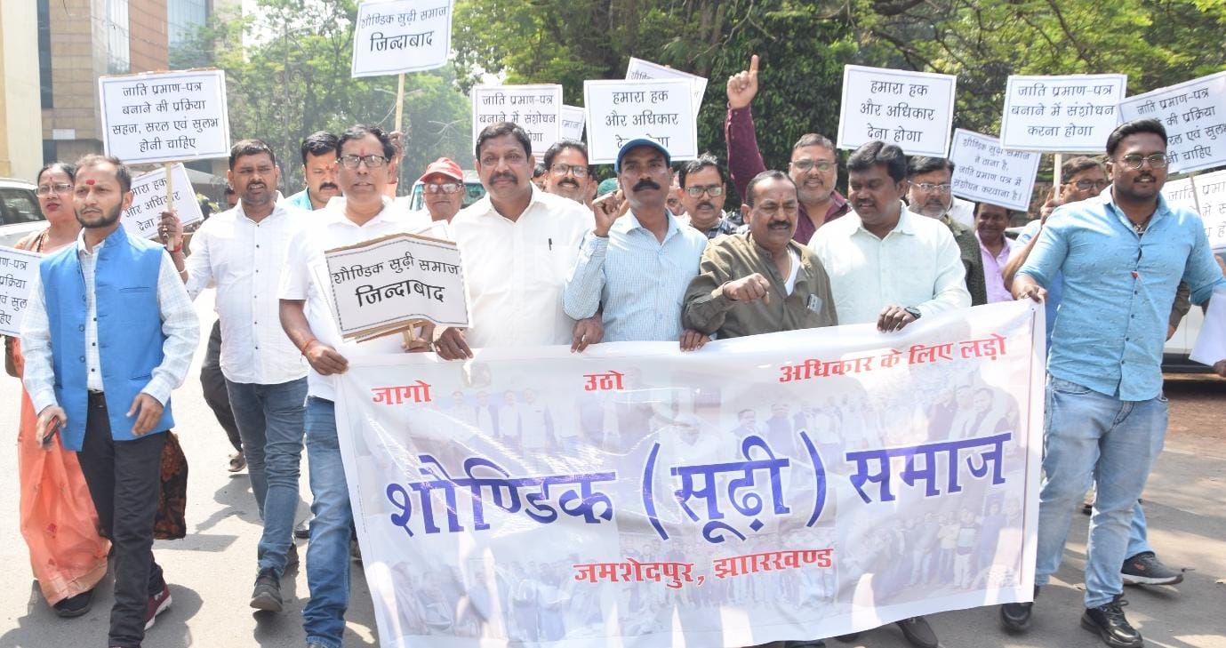 जमशेदपुर: झारखंड के सूढ़ि (शौण्डिक) समाज ने जाति प्रमाण पत्र बनाने की प्रक्रिया में संशोधन और सूढ़ि समाज को अनुसूचित जाति में शामिल करने की मांग को लेकर एक विशाल रैली निकाली. इस रैली में सैकड़ों लोग साकची रेड क्रॉस भवन से होते हुए जिला उपायुक्त कार्यालय पहुंचे. रैली में लोग तख्तियों के साथ नारे लगा रहे थे और अपनी मांगों को लेकर जोरदार प्रदर्शन कर रहे थे.