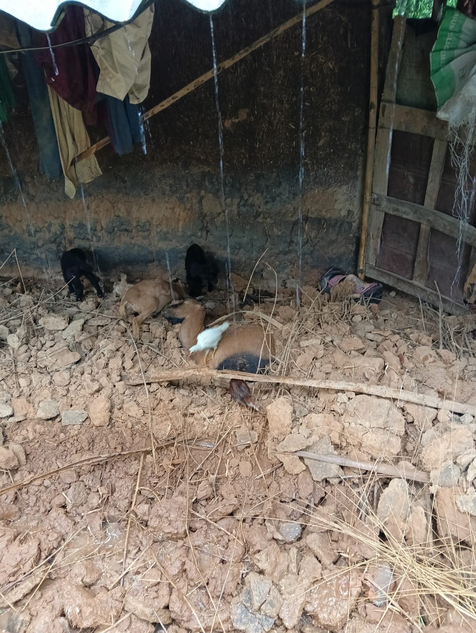 प्रभावित व्यक्ति निताई कर्मकार ने बताया कि भारी बारिश के कारण उनके कच्चे मकान की दीवार अचानक ढह गई। उसी कमरे में उनके पालतू बैल, बकरी और खस्सी बंधे हुए थे।