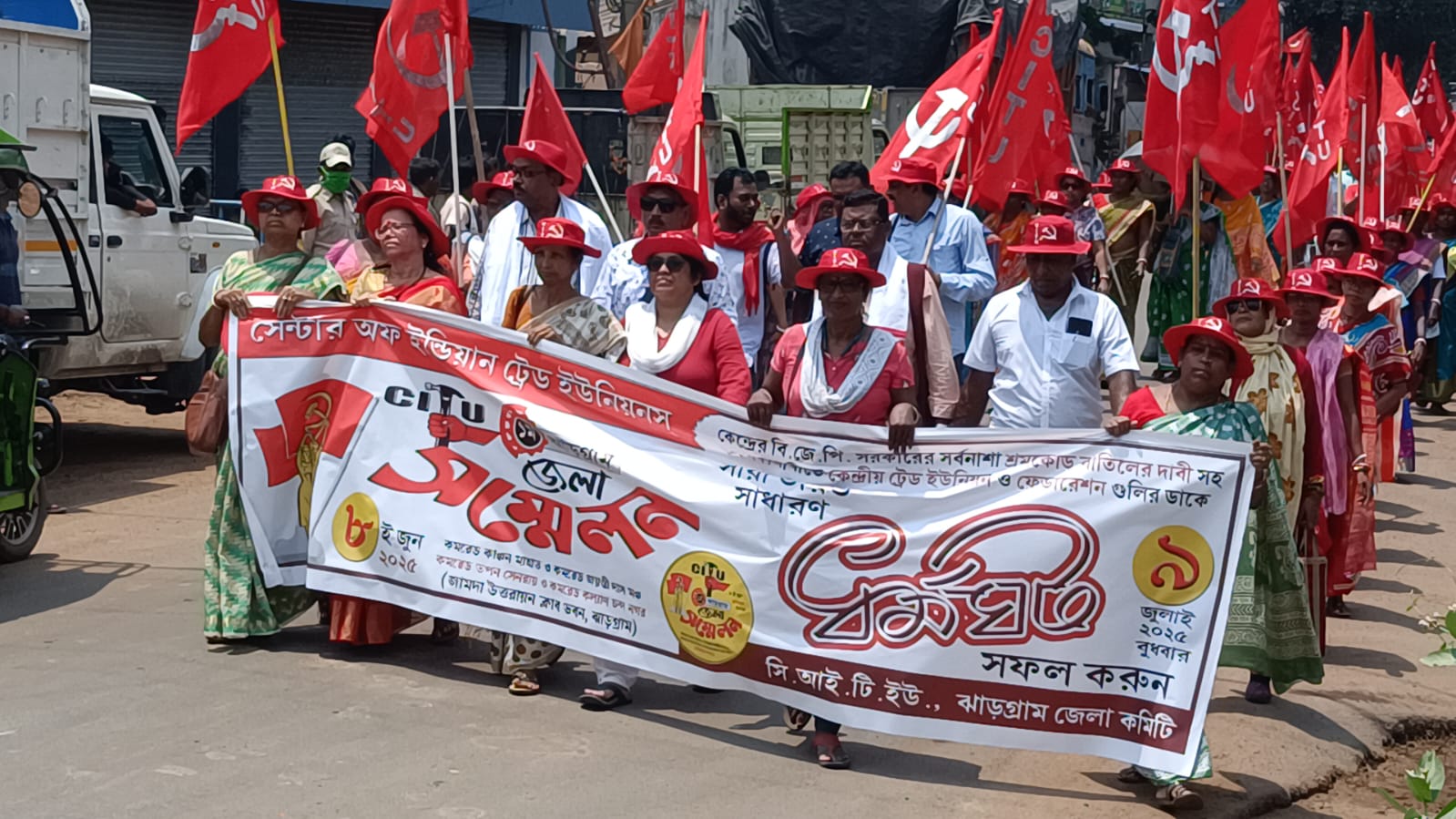 Jhargram : सेंटर ऑफ इंडियन ट्रेड यूनियन्स (सीटू) का जिला सम्मेलन रविवार को झाड़ग्राम शहर में रंगारंग जुलूस के साथ शुरू हुआ। जुलूस शहर के विभिन्न हिस्सों से गुजरा और सम्मेलन स्थल पर समाप्त हुआ। झाड़ग्राम के सड़कें मजदूर लोगों की सक्रिय भागीदारी से भरी हुई थीं। जुलूस में शामिल लोग संगठन का लाल झंडा और विभिन्न मांगों वाली तख्तियां लेकर चल रहे थे।