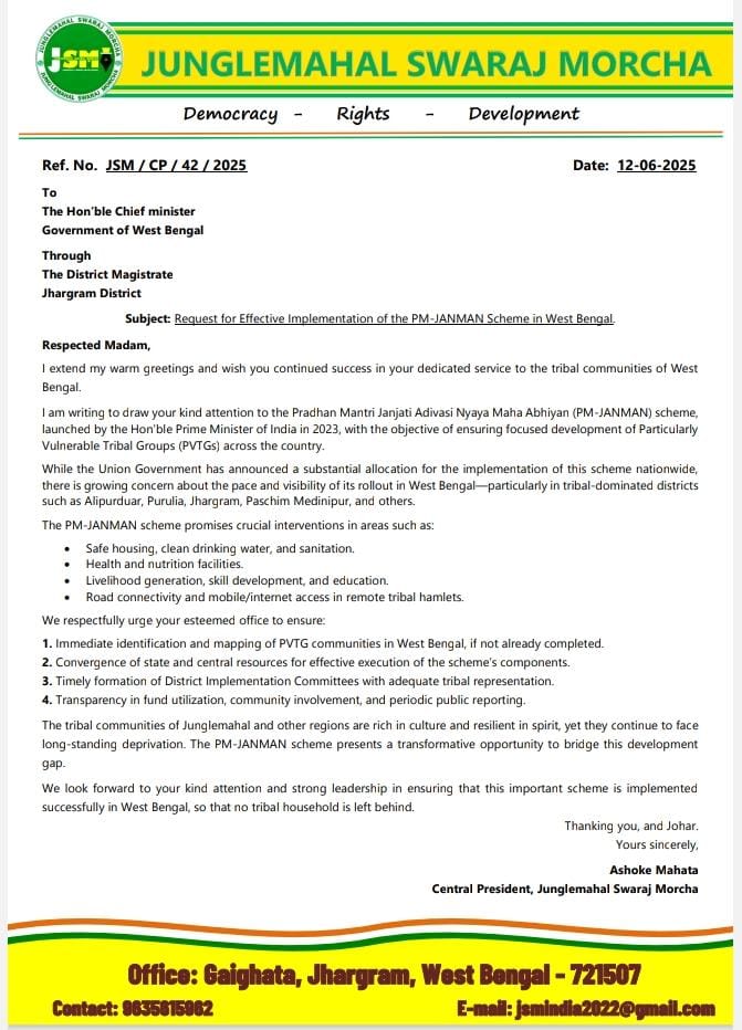 झाड़ग्राम : जंगलगमहल स्वराज मोर्चा के केंद्रीय अध्यक्ष अशोक महातो ने झाड़ग्राम जिला शासक के माध्यम से पश्चिम बंगाल की मुख्यमंत्री को एक पत्र प्रेषित किया है, जिसमें राज्य में “प्रधानमंत्री जनजातीय आदिवासी न्याय महा अभियान” (PM-JANMAN) योजना के प्रभावी एवं शीघ्र क्रियान्वयन की माँग की गई है।
