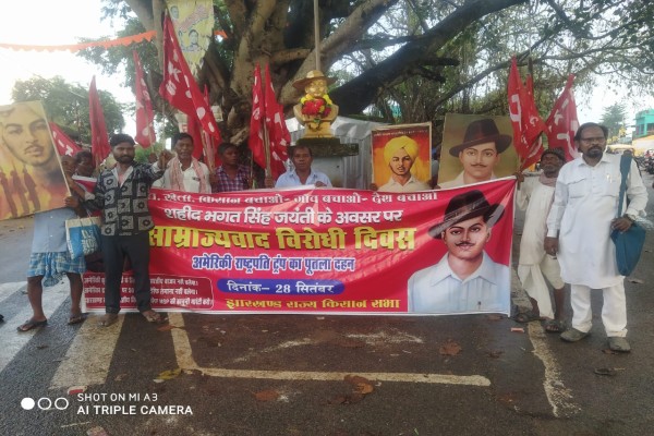राँची: शहीद भगत सिंह जयंती के अवसर पर शहीद भगत सिंह चौक, राँची में झारखंड राज्य किसान सभा के तत्वावधान में साम्राज्यवाद विरोधी दिवस मनाया गया। कार्यक्रम की शुरुआत भगत सिंह की प्रतिमा पर माल्यार्पण से हुई। मुख्य वक्ता राज्य अध्यक्ष सुफल महतो ने अपने संबोधन में शहीद भगत सिंह की जीवनी और विचारधारा पर प्रकाश डालते हुए कहा कि भगत सिंह का मार्ग भ्रष्टाचार, लूट-घोटाला और कारपोरेट लूट के खिलाफ लड़ने का रास्ता है।