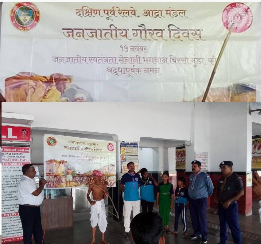 सरायकेला : दक्षिण पूर्व रेलवे, आद्रा मंडल ने “जनजातीय गौरव दिवस-2025” और भगवान बिरसा मुंडा की 150वीं जयंती के अवसर पर पूरे उत्साह और श्रद्धा के साथ कई कार्यक्रम आयोजित किए। इस आयोजन में जन-जागरूकता, सांस्कृतिक और प्रेरणादायी गतिविधियों के माध्यम से बिरसा मुंडा के जीवन और आदिवासी गौरव को उजागर किया गया।