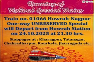 खड़गपुर: छठ पूजा के पावन अवसर पर यात्रियों की सुविधा को ध्यान में रखते हुए, रेलवे हावड़ा से नागपुर के बीच एकतरफा अनारक्षित विशेष ट्रेन चला रहा है। ट्रेन संख्या 01066 हावड़ा-नागपुर विशेष ट्रेन 24 अक्टूबर 2025 (शुक्रवार) को रात 9:30 बजे हावड़ा स्टेशन से प्रस्थान करेगी।