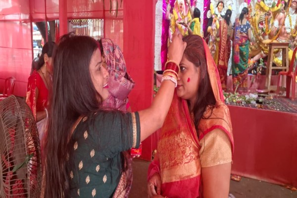 मां दुर्गा की प्रतिमा के सामने महिलाओं ने सिंदूर खेला का आयोजन किया। इस दौरान एक-दूसरे के गालों पर सिंदूर लगाकर उन्होंने उत्सव का आनंद लिया और कहा — “मां आसछे, बोछोर आबार आसबे” (मां आई हैं, अगले वर्ष फिर आएंगी)।